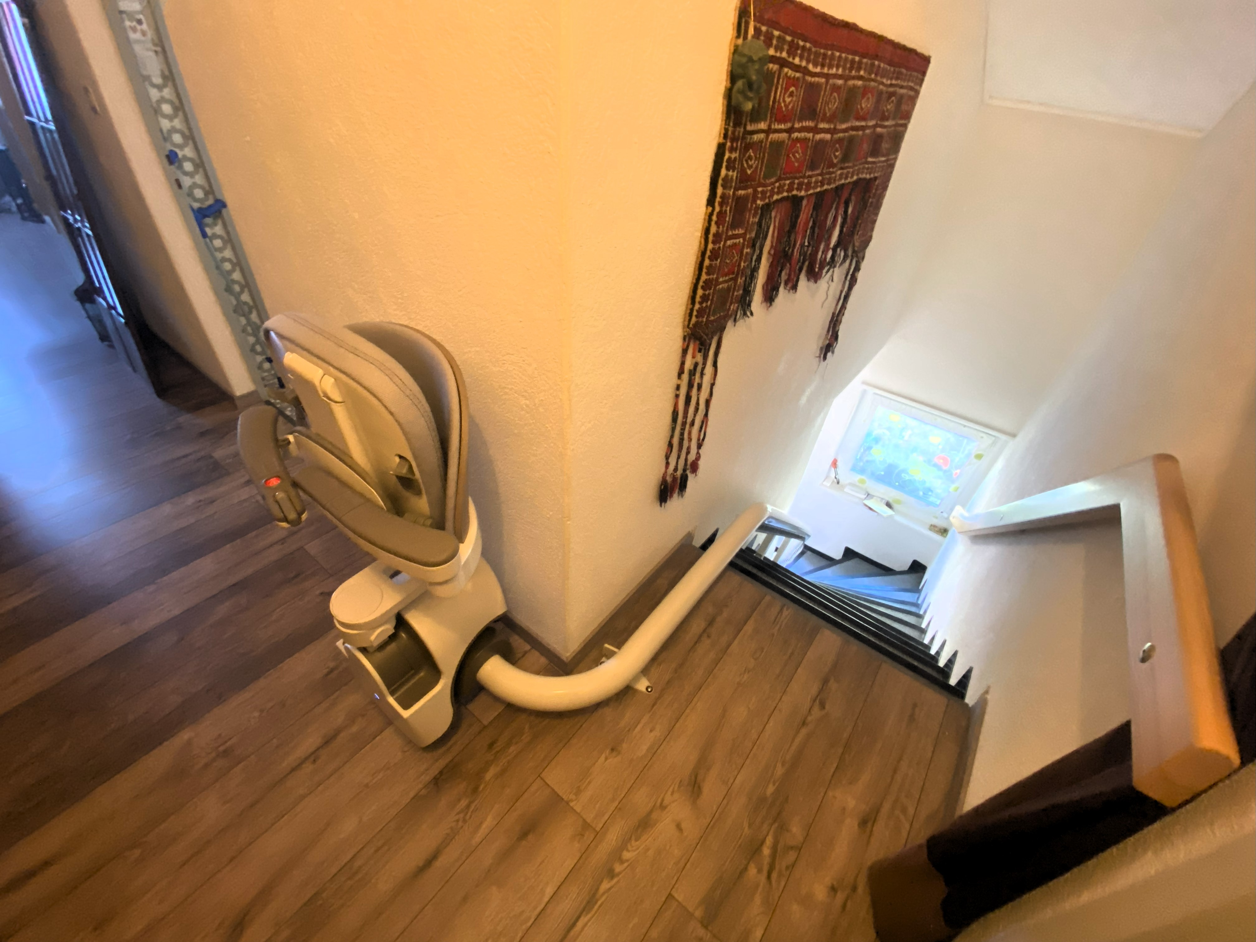 Der Treppenlift ist einfach nur Gold wert, sagt die Wirtin des Restaurants Reussbrücke «s'ewige Liechtli» in Rottenschwil. Nach einem Unfall mit Spitalaufenthalt und anschliessender Kur wurde klar, dass Frau Bruderer ohne Unterstützung nicht mehr nach Hause kann, die Treppe wäre ein zu grosses Hindernis. Während der auswärtigen Genesung kümmert sie sich weiterhin um Menukarten und ihren Verantwortungsbereich im Restaurant, zeitgleich bemühen sich ihr Mann und ihre Tochter um einen Treppenlift. Es gilt keine Zeit zu verlieren, damit sich Frau Bruderer sicher einigermassen selbstständig bewegen kann, wenn sie nach Hause kommt. Von der ganzen Planung und der Montage bekam sie tatsächlich nichts mit und staunte bei der Rückkehr in ihr Daheim nicht schlecht, dass sie die hinderliche Treppe von Anfang an mühelos und selbstständig überwinden konnte. Ein Alltag ohne diesen Treppenlift ist für sie nicht mehr vorstellbar.