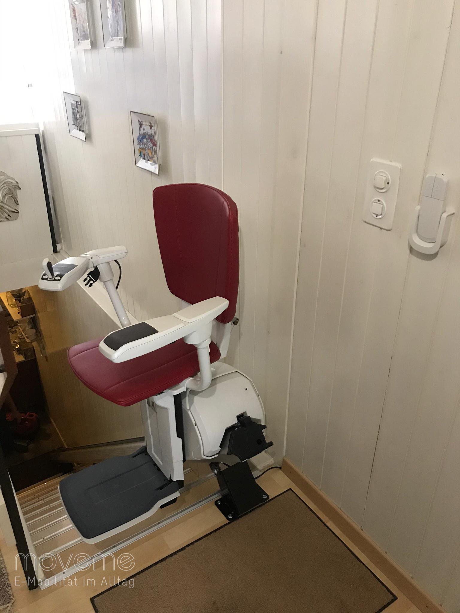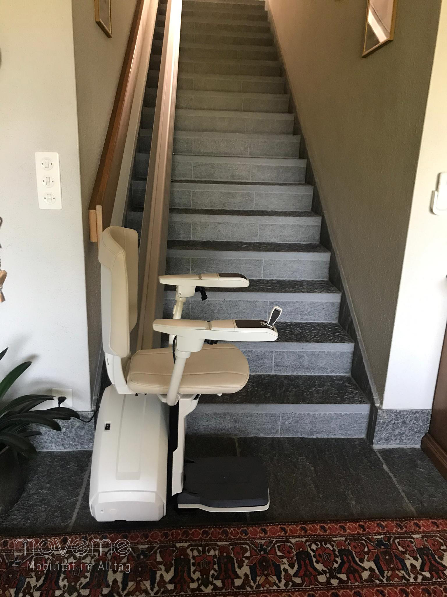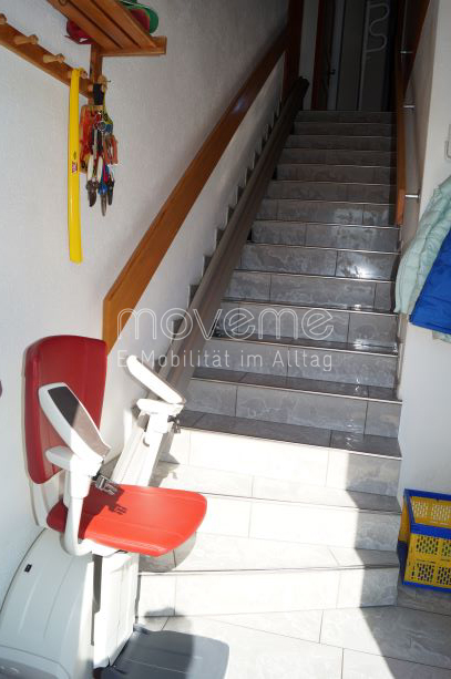 Im Jahr 2013 besuchte Herr Weidmann das Oldtimer-Traktorentreffen in Möriken. Dort gab es nicht nur Traktoren zu sehen, auch die moveme ag gehörte zu den Ausstellern. Sie zeigte eine Auswahl an verschiedenen Elektromobilen und stellte die Möglichkeiten eines Treppenliftes vor. Herr Weidmann, ein ehemaliger Swissair-Pilot, der seinen Weitblick stets beibehalten hat, dachte sich, dass ein Treppenlift eventuell später einmal zum Thema werden könnte, und steckte sich einen Prospekt ein. Jahre später ist das Treppensteigen für seine Frau mühsamer geworden, und der Gang in ein anderes Stockwerk ist nicht mehr so einfach. Und da erinnerte sich Herr Weidmann an den Prospekt und die moveme ag. Nach der Auftragserteilung wurden die Treppen durch ein fotografisches Messsystem millimetergenau ausgemessen und ein digitaler CAD-Plan erstellt, wonach die Produktion der Liftanlagen erfolgte. Und so sind nun Herr und Frau Weidmann im Besitz eines «Homeglide Extra» für die gerade Treppe, die in den Keller führt, sowie eines «Flow2» für die kurvige Treppe in den oberen Stock. «Es erleichtert vieles», sagt Frau Weidmann, «auch die geografische Nähe floss in die Entscheidung für die moveme ag mit ein.» Von den Monteuren sind sie begeistert, die Montage verlief reibungslos, schnell und sauber, und die Lifte bewähren sich jeden Tag.